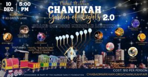 Chanukah Extravaganza - Garde of Lights 2.0 🎉🕎Get ready for the most anticipated Chanukah event of the year! Chabad of Markham is excited to present 𝗚𝗮𝗿𝗱𝗲𝗻 𝗼𝗳 𝗟𝗶𝗴𝗵𝘁𝘀 𝟮.𝟬 𝗼𝗻 𝗗𝗲𝗰𝗲𝗺𝗯𝗲𝗿 𝟭𝟬𝘁𝗵!🕎🎉 Join us with your family and friends for an unforgettable night of fun and celebration! 🚂 Travel back in time with the 𝗖𝗵𝗮𝗻𝘂𝗸𝗮𝗵 𝗘𝘅𝗽𝗿𝗲𝘀𝘀 𝗧𝗿𝗮𝗶𝗻, and immerse yourself in the festive atmosphere with 𝗗𝗝 𝗦𝗮𝗹𝘁𝘆 𝗘𝗻𝘁𝗲𝗿𝘁𝗮𝗶𝗻𝗺𝗲𝗻𝘁.🎶 Experience the beauty of Chanukah with unique light displays, and shop for…
