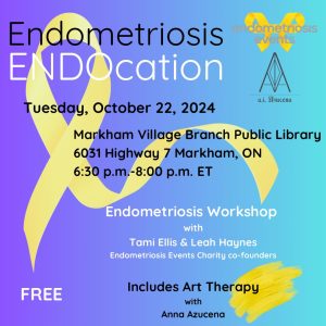 On Tuesday, October 22nd from 6:30pm-8pm at Markham Village Branch Public Library there will be an FREE Endometriosis Workshop facilitated by the registered charity, Endometriosis Events. During the workshop the co-founders will be discussing their lived experience with endometriosis, the importance of menstrual health, physical and mental well-being and self advocacy. Participants will also take part in art therapy session.